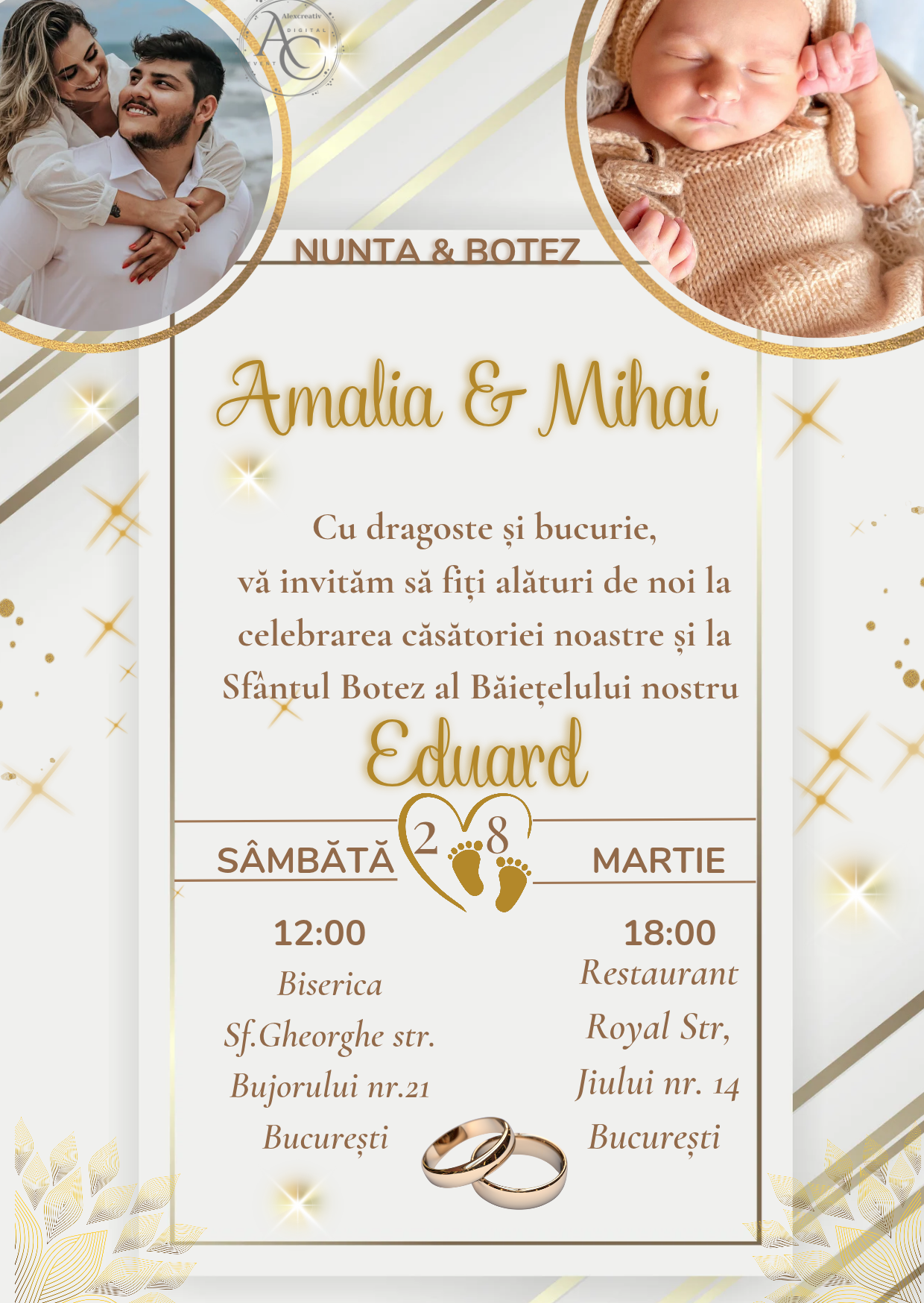 Această invitație digitală combină emoția unei nunți cu bucuria botezului băiețelului tău, într-un design elegant și personalizabil.