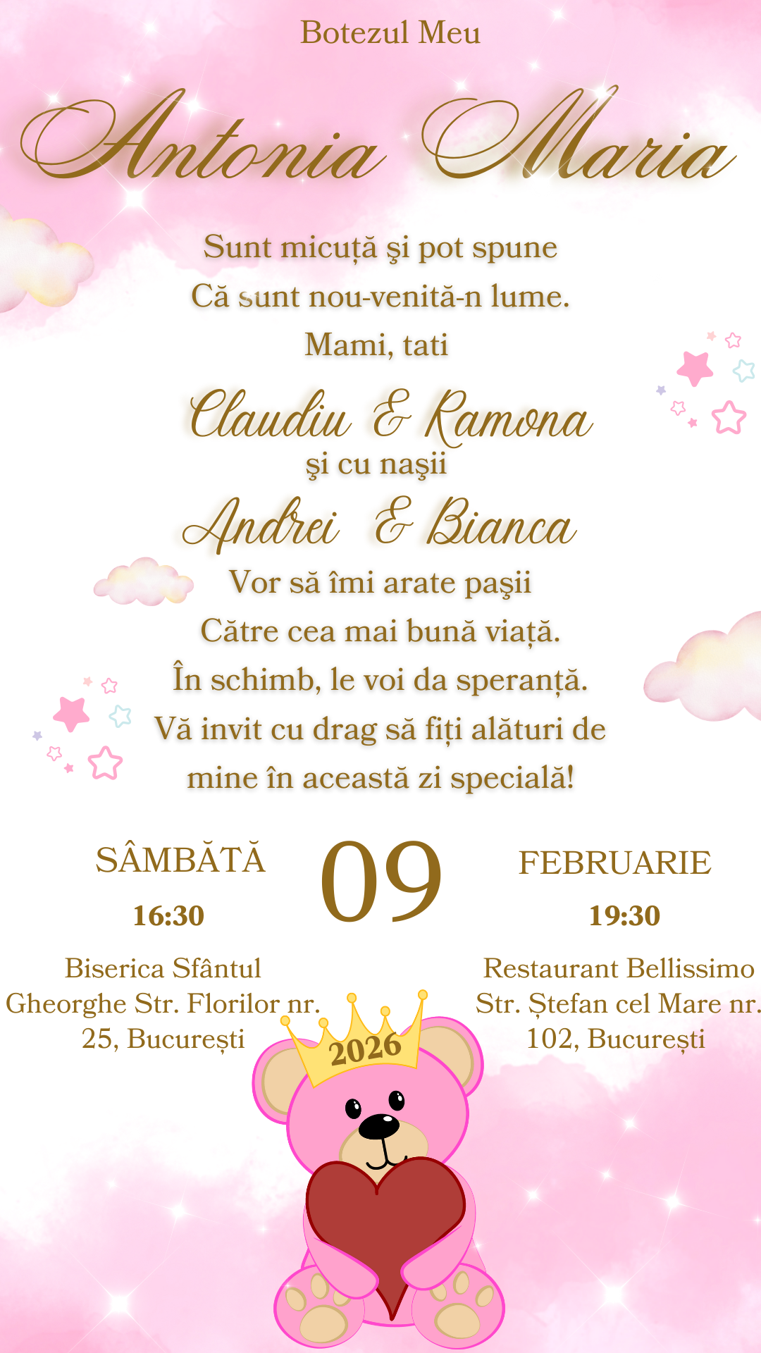 O invitație digitală adorabilă pentru botezul unei fetițe. Modelul roz pastel cu ursuleț și detalii aurii inspiră delicatețe și bucurie. Textul versificat și stilul modern transformă invitația într-o alegere caldă și prietenoasă. Poate fi personalizată rapid și trimisă online, oferind invitaților o amintire de suflet.